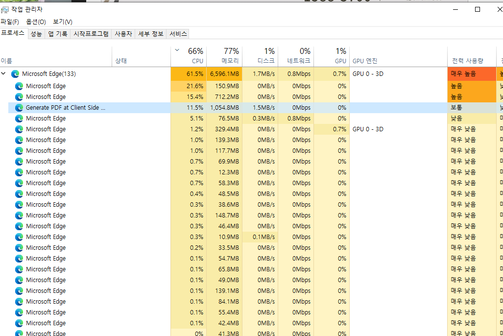 컴퓨터 프로세스별 메모리 사용량