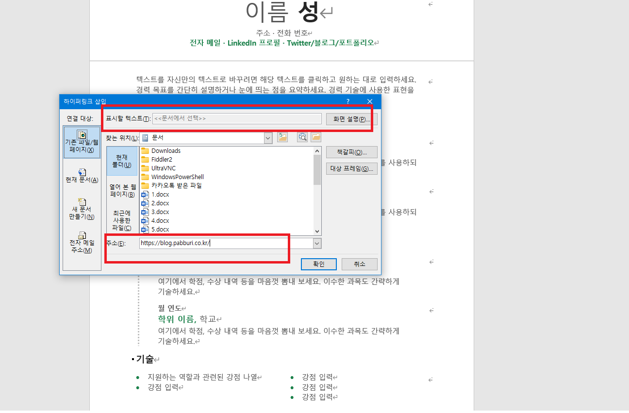 우리가 원하는 것은 문서에서 범위 선택한 텍스트(글자) 부분이 링크로 걸리는 것입니다. 그렇게 하기 위해선 위처럼 '표시할 텍스트' 부분에 <<문서에서 선택>> 으로 선택되어 있어야 합니다. 그렇지 않으면 이부분에 입력한 그 것이 워드 문서에 보여지게 됩니다.