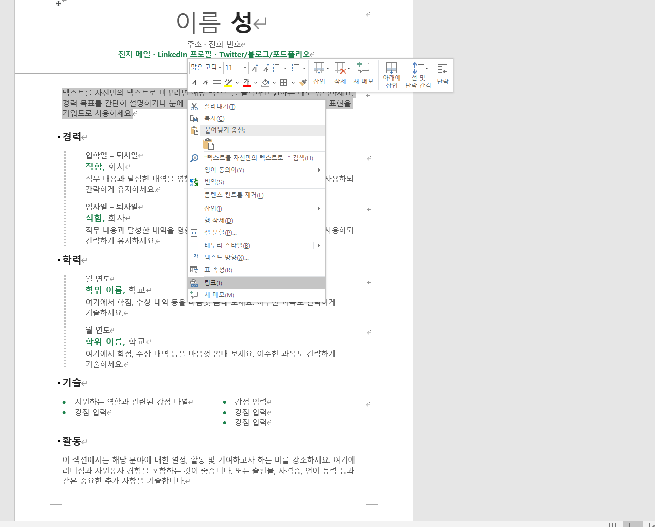 링크를 넣기 위해선 마우스 오른쪽 버튼을 클릭하고 '링크' 메뉴를 선택하면 됩니다.