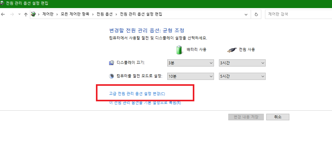 5) "고급전원관리옵션" 설정 변경을 클릭해서 들어 갑니다.