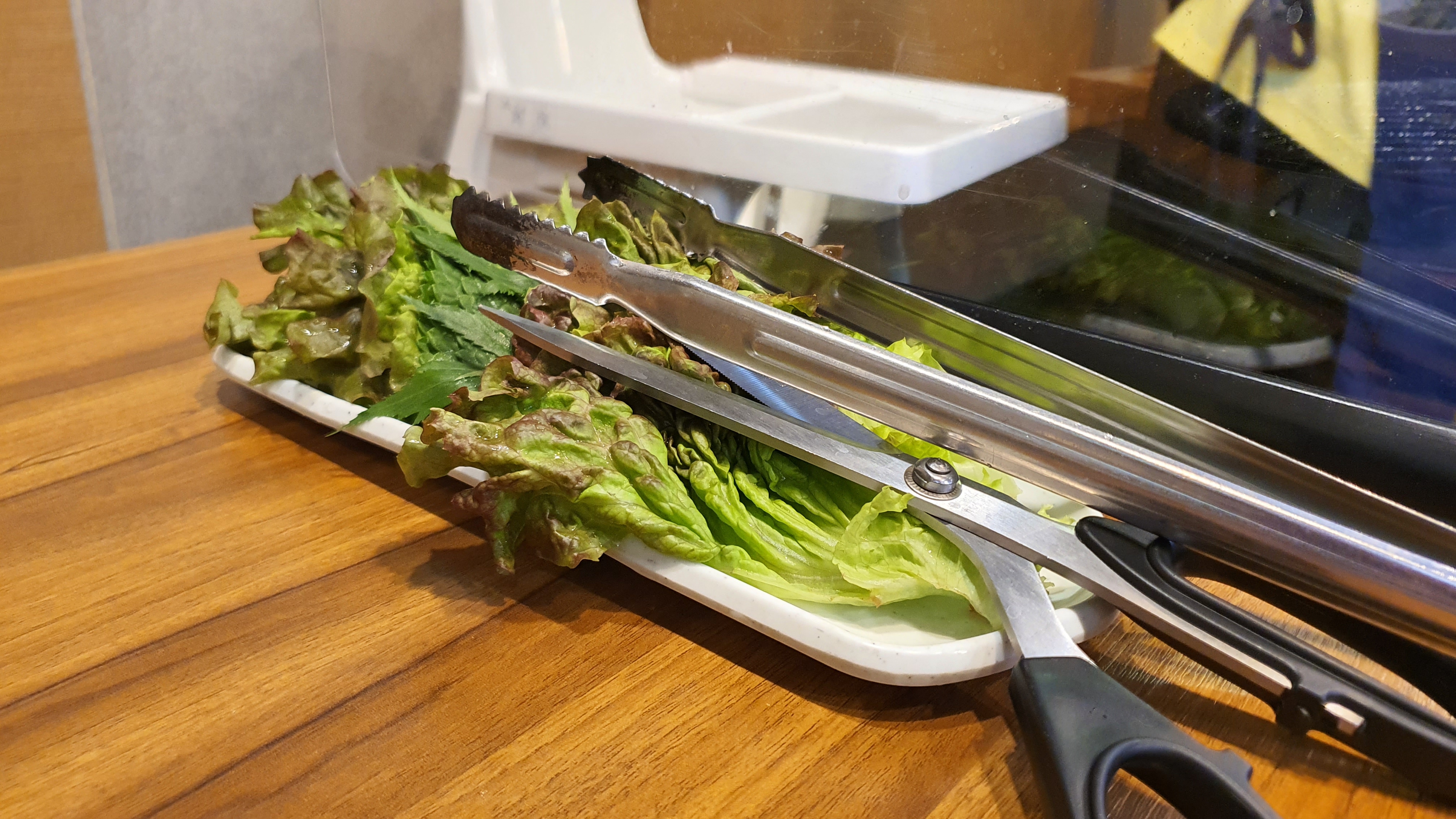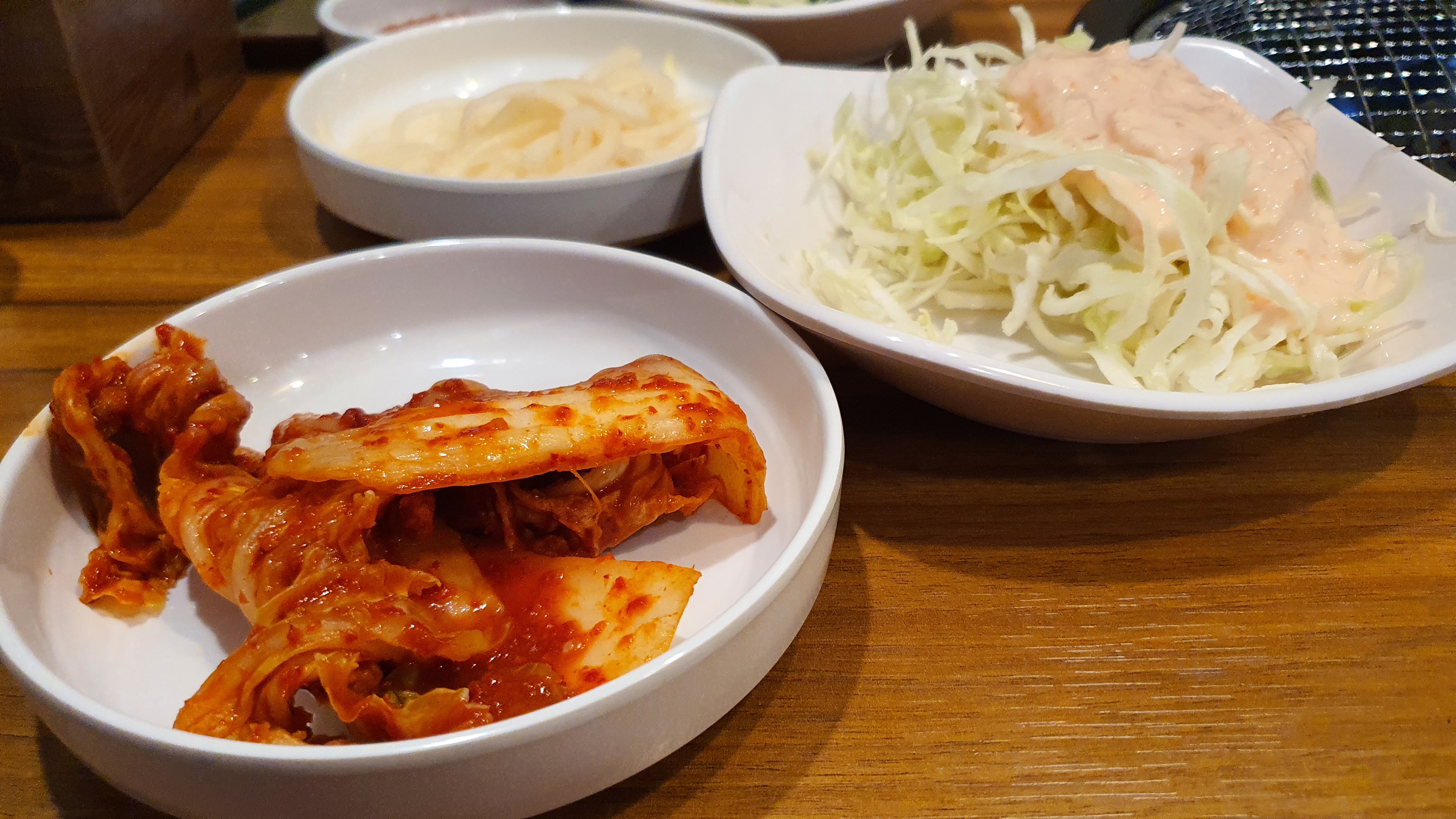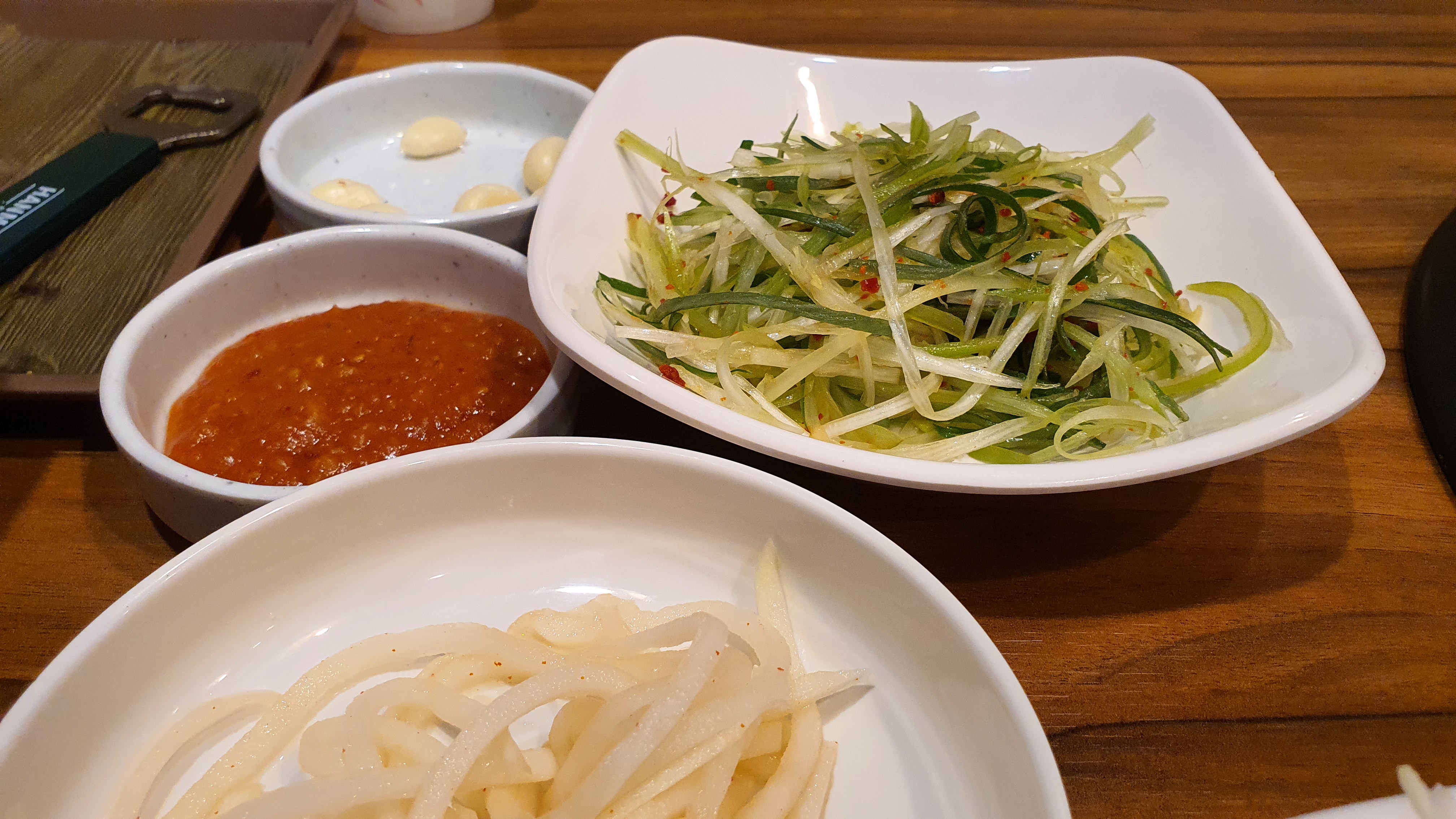 마늘과 그리고 된장 그리고 파를 썰어 놓아 양점이 되어 있는 고추가루가 보이는 그런 반찬과 상추와 쌈을 같이 먹을 수 있습니다. 기본은 이렇게 나오고 추가적으로 양것 자신이 직접 가서 가져올 수 있도록 되어 있습니다.