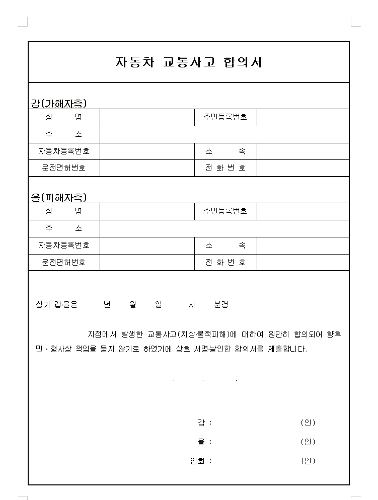 교통사고 합의서는 발상한 사고에 대해서 물적피해, 치상에 대해 원만히 합의 되어 향후에 민사와 형사상의 책임을 서로 묻지 않기로 한 경우 최종적으로 서명날인하고 합의 합니다.