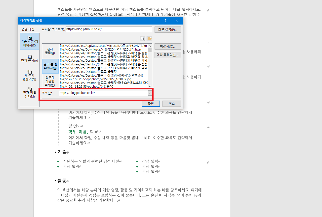 우리가 원하는 것은 문서에서 범위 선택한 텍스트(글자) 부분이 링크로 걸리는 것입니다. 그렇게 하기 위해선 위처럼 '표시할 텍스트' 부분에 <<문서에서 선택>> 으로 선택되어 있어야 합니다. 그렇지 않으면 이부분에 입력한 그 것이 워드 문서에 보여지게 됩니다.